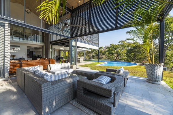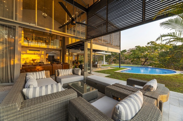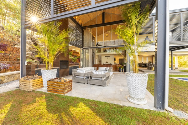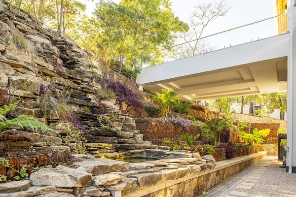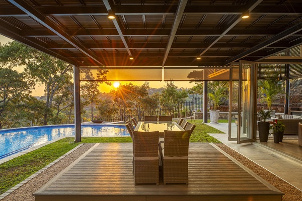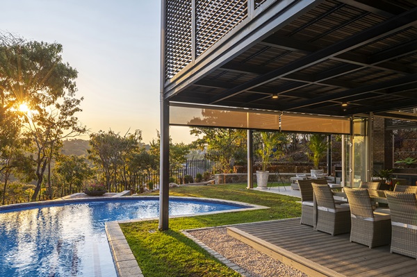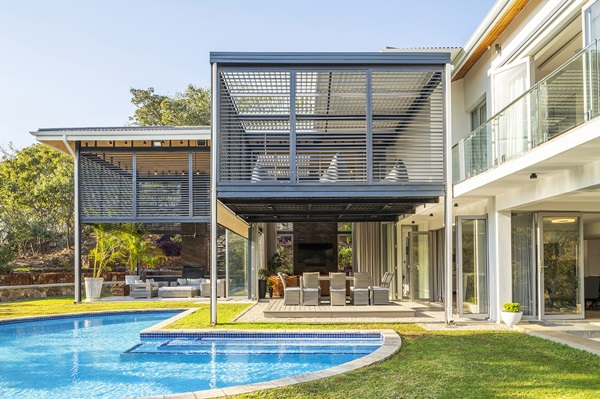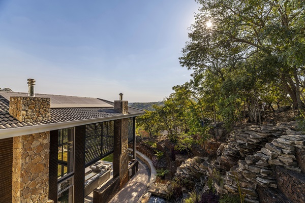 Solution: The client identified with the raw nature of the site, and was enticed by the idea of rustic materials and interior spaces that blurred the line between inside and outside. The entire ground floor of the house is given over to collective living and entertaining, and the kitchen acts as lobby between the dining room and smart lounge - all have been oriented toward the broad south western views. A covered double height veranda offers occupants the option to relax and entertain beneath shaded canopy, whilst a double height pergola covers a second terrace, and offers occupants a sunnier external experience depending on the season. Low western sun light is screened by louvred sun screens. Access from the car port is directly into the kitchen via the scullery, and stairs allow access up to the first floor bedroom zone, and then finally to the second floor private lounge and TV room. The second floor is connected to the indigenous Msasa tree grove, by means of a north facing deck, where a fire pit and seating area is planned.